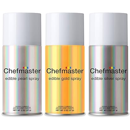 • The Chefmaster by US Cake Supply Edible Spray Food Coloring 3 Color Kit in 2-Ounce Cans - Gold, Silver, Pearl is a