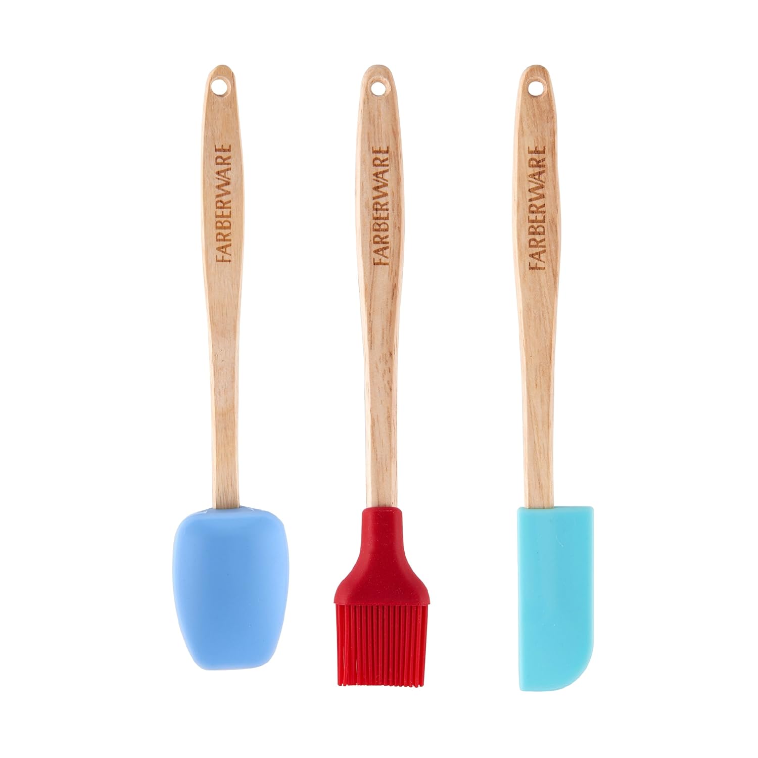 Farberware Baker's Advantage Set of 3 Assorted Mini Spatulas with Wood Handles is best for youThis Set of 3 Farberware Baker's Advantage Mini Spatulas with Wood Handles is ideal for handling smaller jobs around the kitchen, such as scooping contents out of small jars and bowls. The mini pastry brush is perfect for glazing smaller baked goods. A handy ring helps keep the set together for easy storage. Hand wash. Set includes 2 mini spatulas and 1 mini pastry brush.