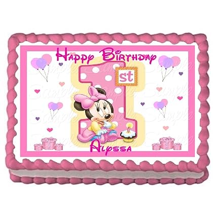 Baby Minnie 1st Birthday Edible Frosting Sheet Cake Topper - 1/4 Sheet is best for youPLEASE ORDER IN ADVANCE, I WILL NOT BE HELD RESPONSIBLE FOR DEADLINES YOU MAY HAVE. If shipped and received by the information given to me by Amazon, I will NOT issue a refund due to you not receiving your item(s) in time. Purchasing this item, you agree to these terms. COLORS MAY VARY FROM WHAT THE PICTURE SHOWS SINCE THESE ARE FROSTING SHEETS. The frosting sheet measures approx. 8' x 10.5' for a quarter sheet or cake. If using on a quarter sheet, please be sure this will fit since some supermarkets quarter sheet cakes may be smaller than others. Sometimes using circular images, the print may be off center slightly, but still looks great! Very easy to use. Peel the backing and lay the image on top of your FROSTED treat. (white frosting is recommended for best results) All images are FDA approved and Kosher, Gluten and Soy FREE! No known allergens. No peanut products added. High quality frosting sheets (not wafer or rice paper). High quality edible ink, also certified Kosher. **Returns will be accepted however I will deduct a fee of $3.50 from your refund, since I will not be able to resell your returned image. I will process your refund the same day as I receive back your returned image. Your refund will consist of image price and shipping charge you paid then I will subtract the $3.50 . I will NOT issue a refund due to you not receiving your item(s) in time. Please note: Characters in these images are free. You are paying for our services in creating, customizing and printing them on edible paper for your own personal use. Images remain property of their respective copyright holders and may not be resold. I have many other images. If you are looking for something specific, please ask, chances are I will have it.