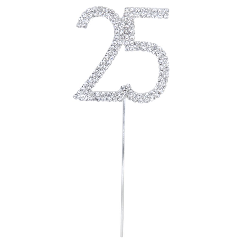 1 X 25th Anniversary Birthday Cake Topper w/Rhinestone Party Decoration is best for youDescription:Stunning rhinestone cake topper Perfect for 25th birthday party or aniversary Material: Alloy,rhinestone Color:Silver Pattern Size(L x H):Approx.5cm x 5cm Total Height:Approx. 12cm Stick Height:Approx. 7cm Package Includes:1 x Cake TopperNote:Since the size above is measured by hand, the size of the actual item you received could be slightly different from the size above. Meanwhile, please be reminded that due to lighting effects, monitor's brightness / contrast settings etc, there could be some slight differences in the color tone of the pictures and the actual item.