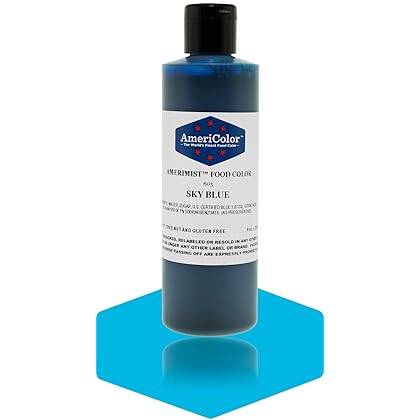 9 Ounce Amerimist Airbrush Food Color SKY BLUE is best for youAmericolor Amerimist air brush colors are super strength, highly concentrated spray-on air brush food colors that are extremely effective, even on the hard to color non-dairy whipped toppings and icings. Their superior strength eliminates the need to overspray so moisture will not accumulate, water spots will not appear, and the icing will not breakdown.