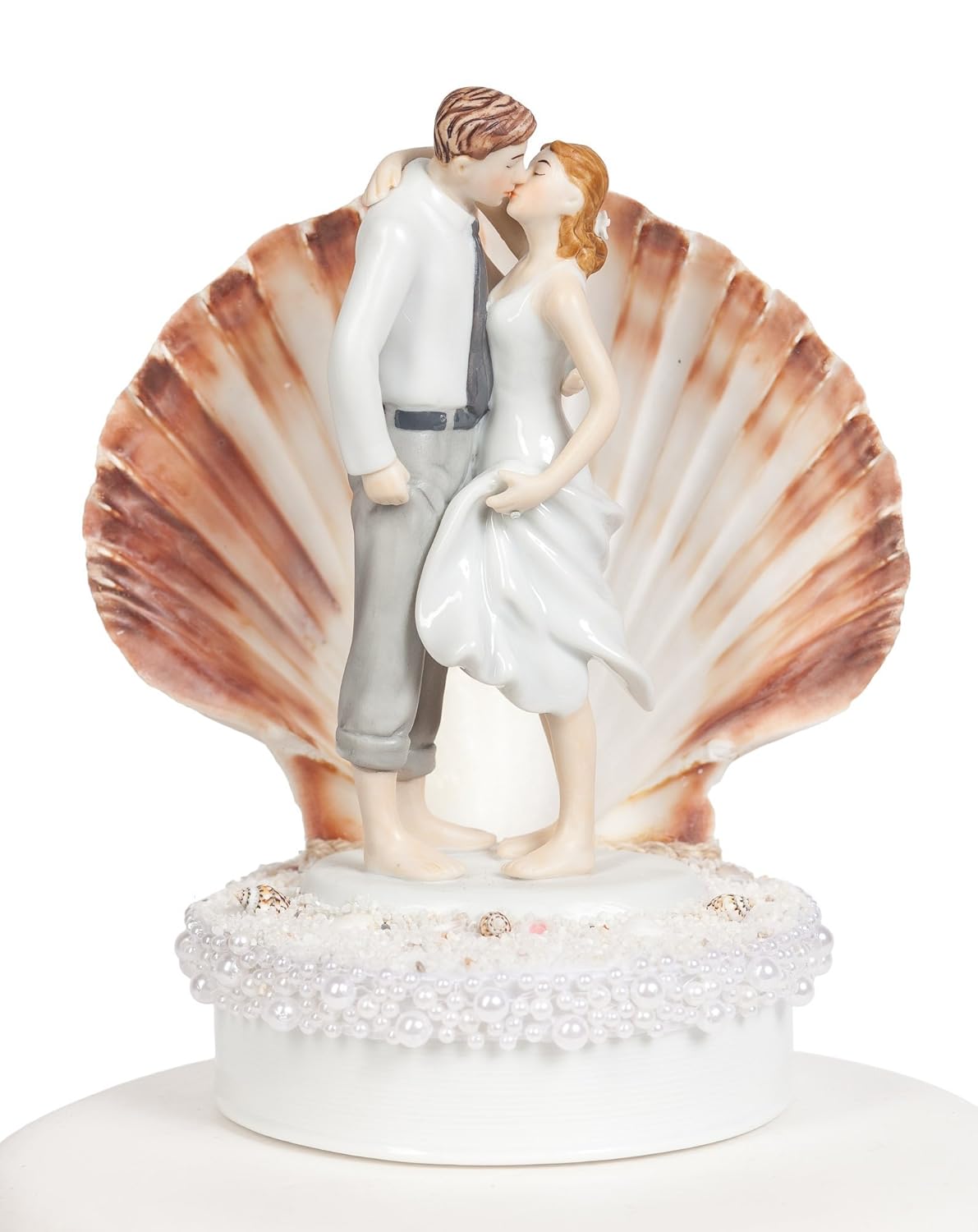 Beach Get Away Shell Wedding Cake Topper is best for youThis creative cake topper features our Beach Get Away Couple on a porcelain base with a large clam shell framing the couple. Delicate shell flowers accompany the couple as they stand on a bed of natural sand and mini shells. A french pearl trim is wrapped around the base as well.