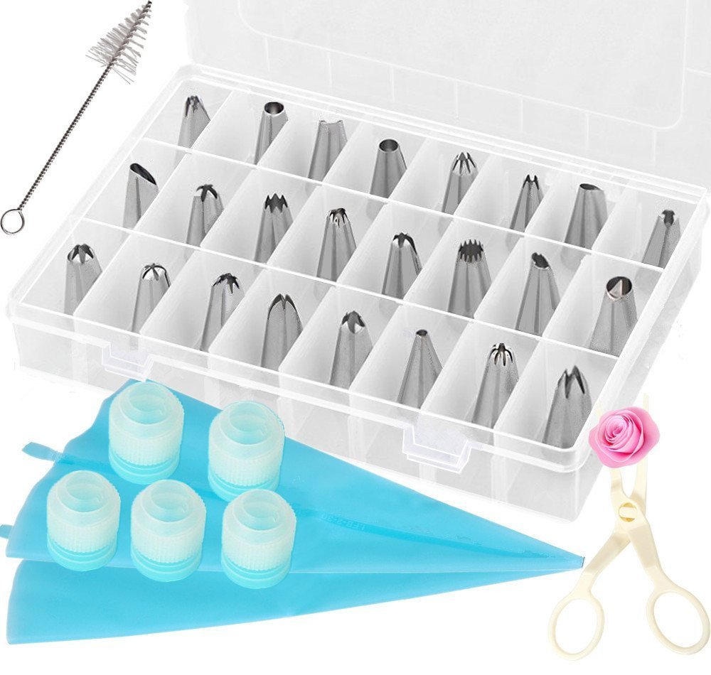 • The 33-Piece Cake Decorating Kit Tips Stainless Steel Icing Tip Set Tools with 2 Silicone Pastry Bags 5 Reusable Couplers 1 Flower Lifter 1 Cleaning Brush for Cakes Cupcakes Cookies Pastry is a