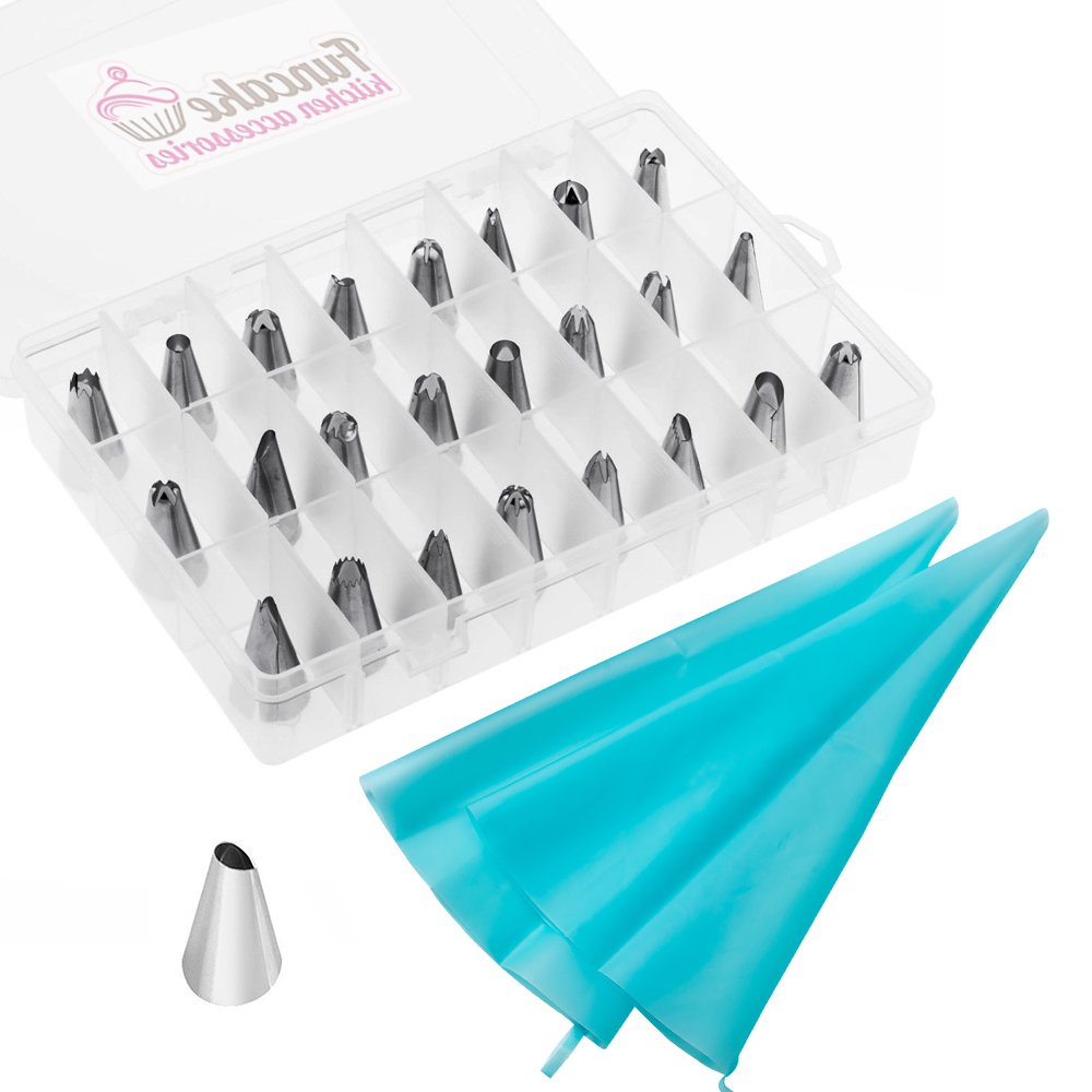 • The Cake Decorating Tips Supplies kit, FUNCAKE 30 in 1 Icing Tools Decorations Set with 2 Bags, 24 Cup Cakes and Cookies Icing Tips, 2 Couplers and E-Book Guide - Great for Cake Piping - 1 Year Warranty is a