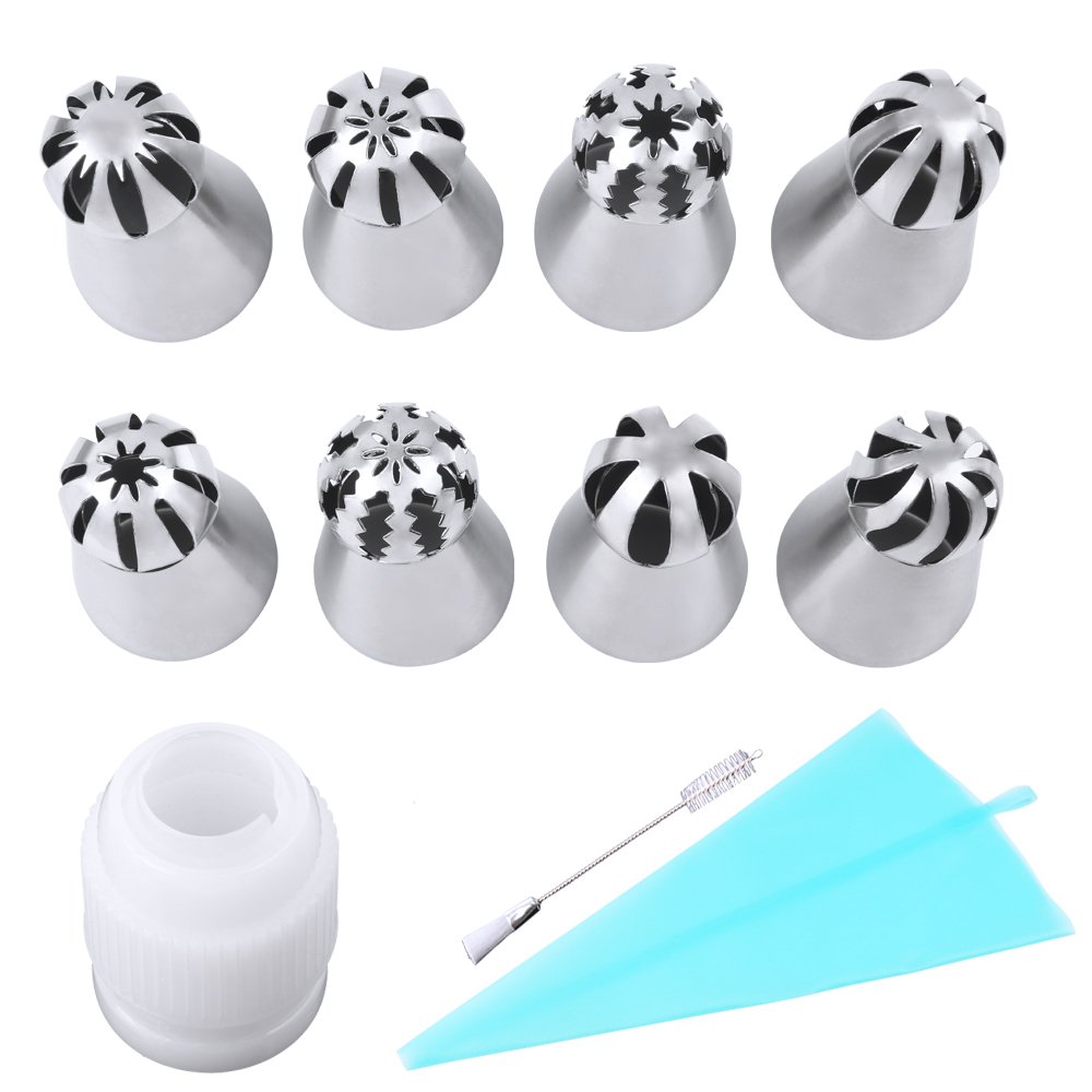 • The Russian Ball Tips, MCIRCO Cake Decorating Supplies 8-piece Stainless Steel Piping Tips Icing Tips Cookies Macaron Cupcake Decorating Kits with Silicone Pastry Bag and Plastic Coupler(Set of 8) is a