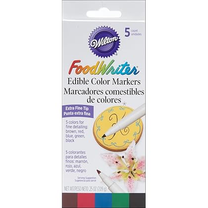 Create the masterpiece you have in mind, with the finest food coloring gels on the market today. Each bottle has an easy to use pop-top cap, with its unique droplet design for precise measurements, allowing you to achieve the same color combinations time after time!the Wilton W609105 Food Writer, Extra-Fine Tip for Edible Color Markers, 0.25-Ounce, 5-Pack - All tips are made from the highest quality, 100% food grade stainless steel (304).- Silicone pastry bags FDA and LFGB approved.- Easy to clean and dishwasher safe.- Compact, lightweight and easy to use.- Made with durable and premium materials so they last for as long as possible.- Meets all industry standards.- Our tips are corrosion resistant so they won't rust.- Reusable and non-stick.- The tips, coupler and case are all tasteless and non-toxic.- Perfect tools to decorate all your cakes, cupcakes, cookies, pastry and more.- 45 days money back or replacement warranty.Wilton W609105 Food Writer, Extra-Fine Tip for Edible Color Markers, 0.25-Ounce, 5-Pack is best for youPackage Quantity:1 | Style Name:Assorted WILTON- Food Writer Set. It's a fast fun way to add colorful designs to all kinds of baked treats! Use a Food Writer Edible Color Marker just as you would an ink marker. Draw fun designs on cakes write messages on cookies or add highlights to icing decorations. This package includes 5 markers: brown red blue green and black. Imported.