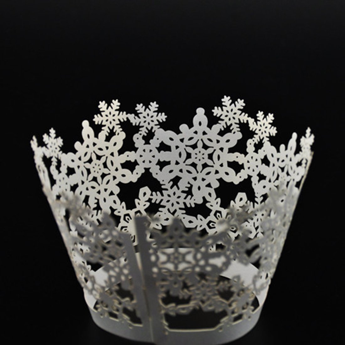 • The DUFUSTORE 50x Pearly Paper Snowflake Design Vine Lace Cupcake Wrappers Table White is a